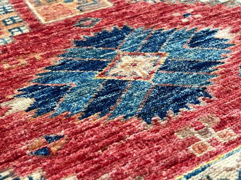 Our Ghazni Kazak rugs are woven in northern Afghanistan, mainly hand-knotted in people's homes as a supplementary source of household income. The wool is sourced from the Ghazni region, and hand-spun and dyed before going to looms for the highly skilled weavers to start work on their unique creation. Finally, once completed, the Kazak rugs are collected from the villages and cross the border to Pakistan to be washed and finished. This is where we source the Kazak rugs for our showroom - each one selected individually and in person.