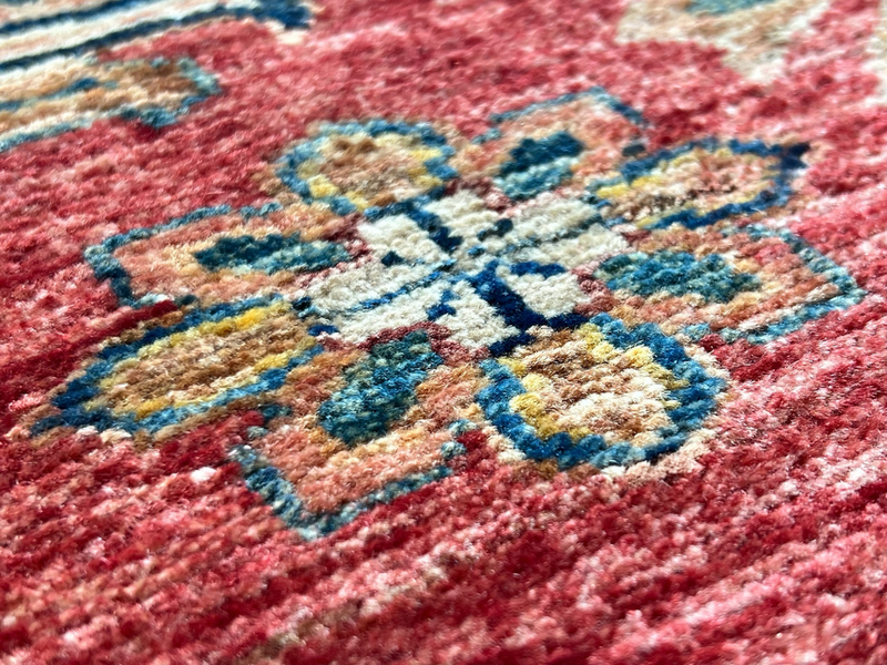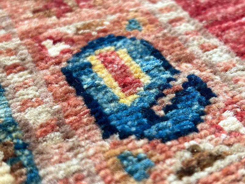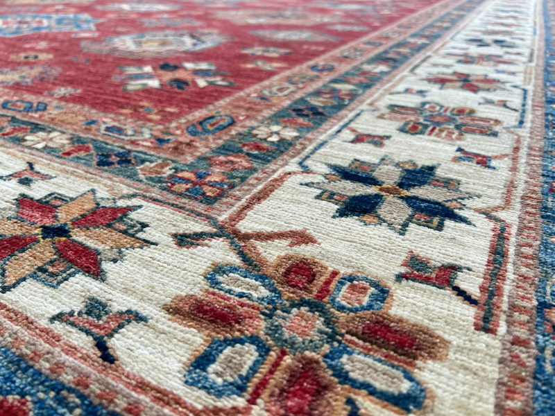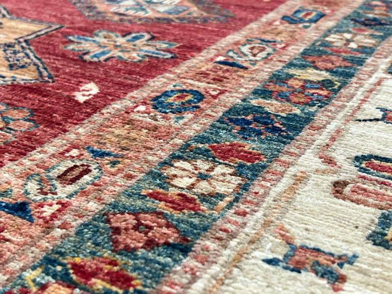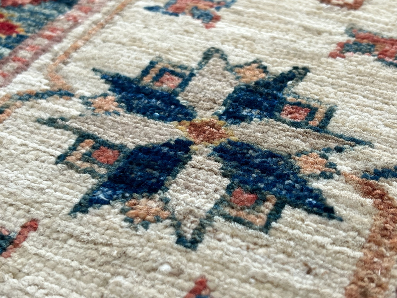 Our Ghazni Kazak rugs are woven in northern Afghanistan, mainly hand-knotted in people's homes as a supplementary source of household income. The wool is sourced from the Ghazni region, and hand-spun and dyed before going to looms for the highly skilled weavers to start work on their unique creation. Finally, once completed, the Kazak rugs are collected from the villages and cross the border to Pakistan to be washed and finished. This is where we source the Kazak rugs for our showroom - each one selected individually and in person.