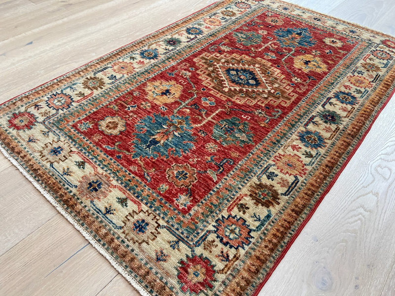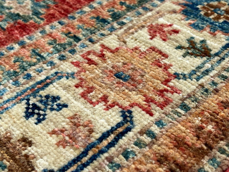 Our Ghazni Kazak rugs are woven in northern Afghanistan, mainly hand-knotted in people's homes as a supplementary source of household income. The wool is sourced from the Ghazni region, and hand-spun and dyed before going to looms for the highly skilled weavers to start work on their unique creation. Finally, once completed, the Kazak rugs are collected from the villages and cross the border to Pakistan to be washed and finished. This is where we source the Kazak rugs for our showroom - each one selected individually and in person.